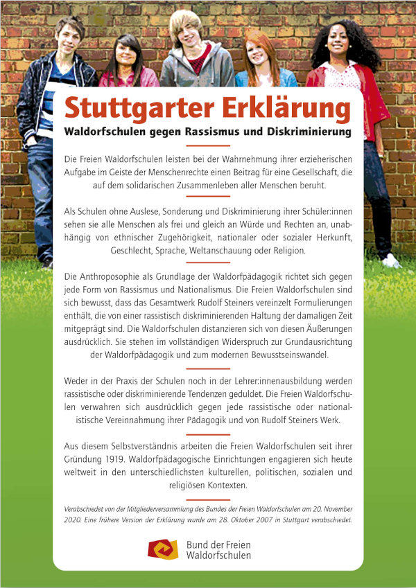 Unser Kindergarten ist Mitglied der Vereinigung der Kindertageseinrichtungen Baden-Württemberg e.V. Die Vereinigung und auch unsere Einrichtung haben sich zwei Stellungnahmen für gesellschaftlichen Zusammenhalt und gegen Extremismus angeschlossen (nachzulesen auch auf der Website der Vereinigung, https://www.waldorfkindergarten-bw.de/ueber-uns/aktuelles/stellungnahmen):